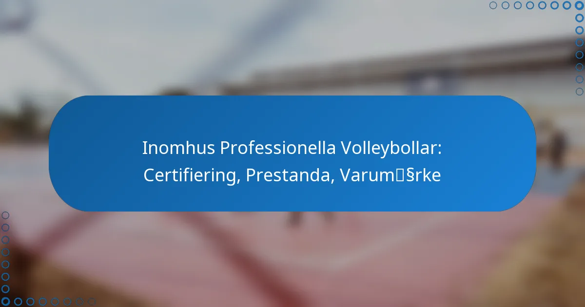 Inomhus professionella volleybollar är föremål för strikta certifieringsstandarder som fastställs av organisationer som Internationella volleybollförbundet (FIVB), vilket säkerställer att de uppfyller viktiga prestations- och säkerhetskriterier. Nyckelprestandamått, såsom vikt, material, studs och grepp, spelar en avgörande roll för att förbättra spelet. Ledande märken som Mikasa, Molten och Wilson är kända för sina högkvalitativa volleybollar, som ofta stöds av professionella idrottare och lag för sina unika egenskaper och pålitlighet.